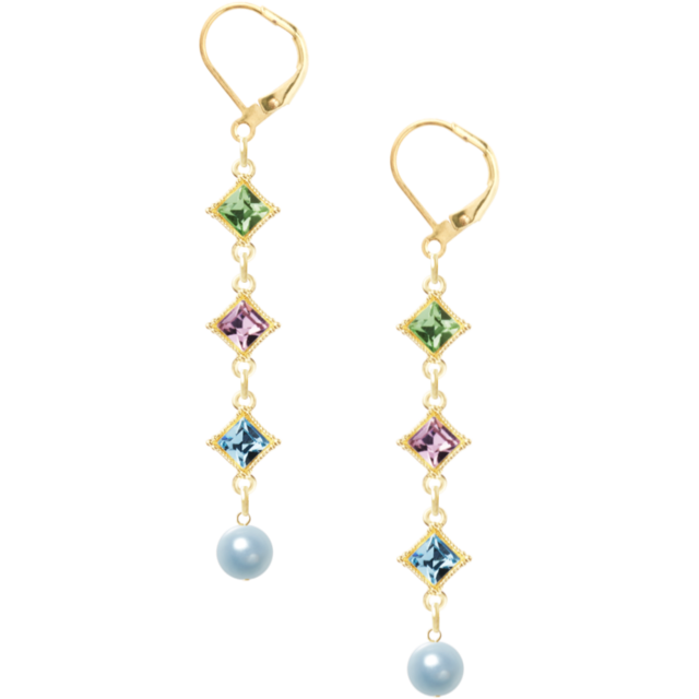 上品な輝きと可愛らしさが融合したLIVE.LIV shopの新作ピアスです。3連のスワロフスキー(アクアマリン、ペリドット、ライトアメジスト)と、美しいパールスカイブルーが繊細なデザインを引き立てています。耳元で揺れるさりげない輝きは、どんなシーンにも華やかさをプラスしてくれます。